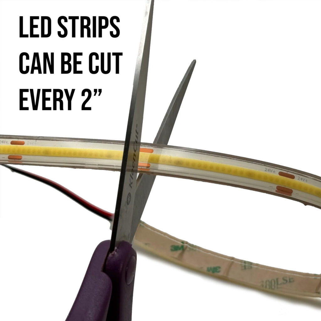 The LED strip in your kit can be cut down to size. When cutting the strip it’s important to cut it in the middle of the copper connectors. They are spaced about 1.75″ apart along the length of the strip.